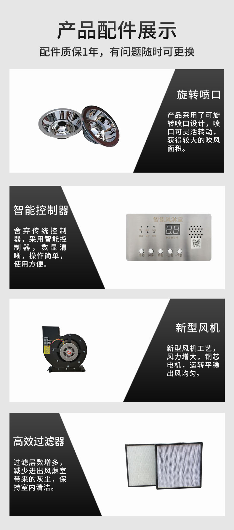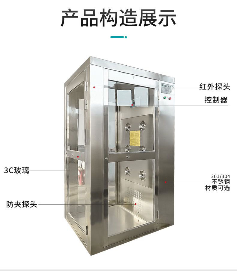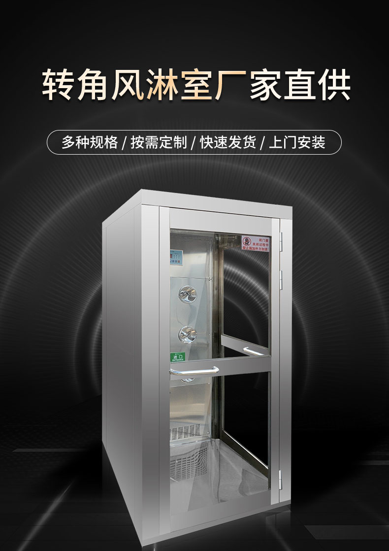 描述:轉(zhuǎn)角風淋室感應自動吹淋,透明視窗,內(nèi)部吹淋狀況隨時可見;軟件試控制器,LED顯示及設置吹淋時間,范圍0~99秒可調(diào),內(nèi)部采用圓的漸開線風道,高風速,低噪音。